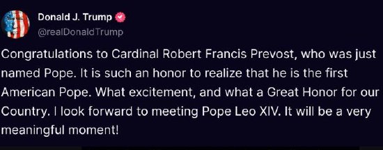 美国总统特朗普在Truth Social发文祝贺,并表示,“得知他是首位来自美国的教皇,真是一种荣幸”,“对我们国家是何等的荣耀”。