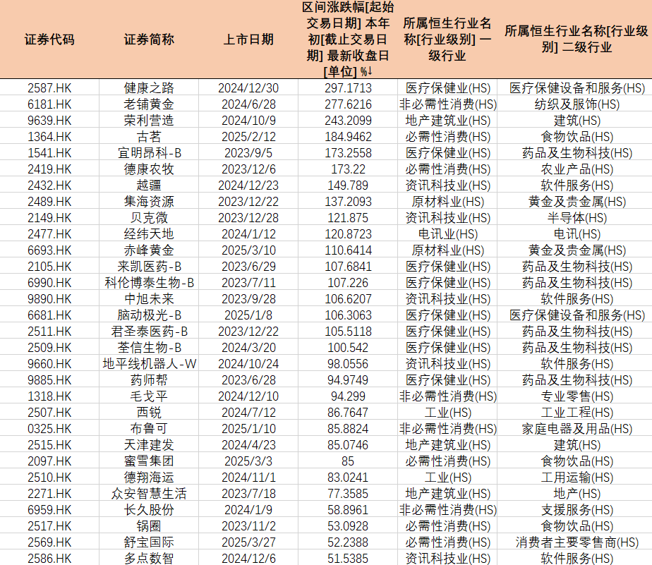 17只次新股年内股价翻倍,其中12只来自医药、消费、有色金属三大行业,占比更集中。医疗保健行业7只,占总数比重四成;消费行业3只,古茗(01364.HK)与德康农牧为必选消费,老铺黄金为可选消费;集海资源(02489.HK)和赤峰黄金(06693.HK)2只个股来自有色金属行业。